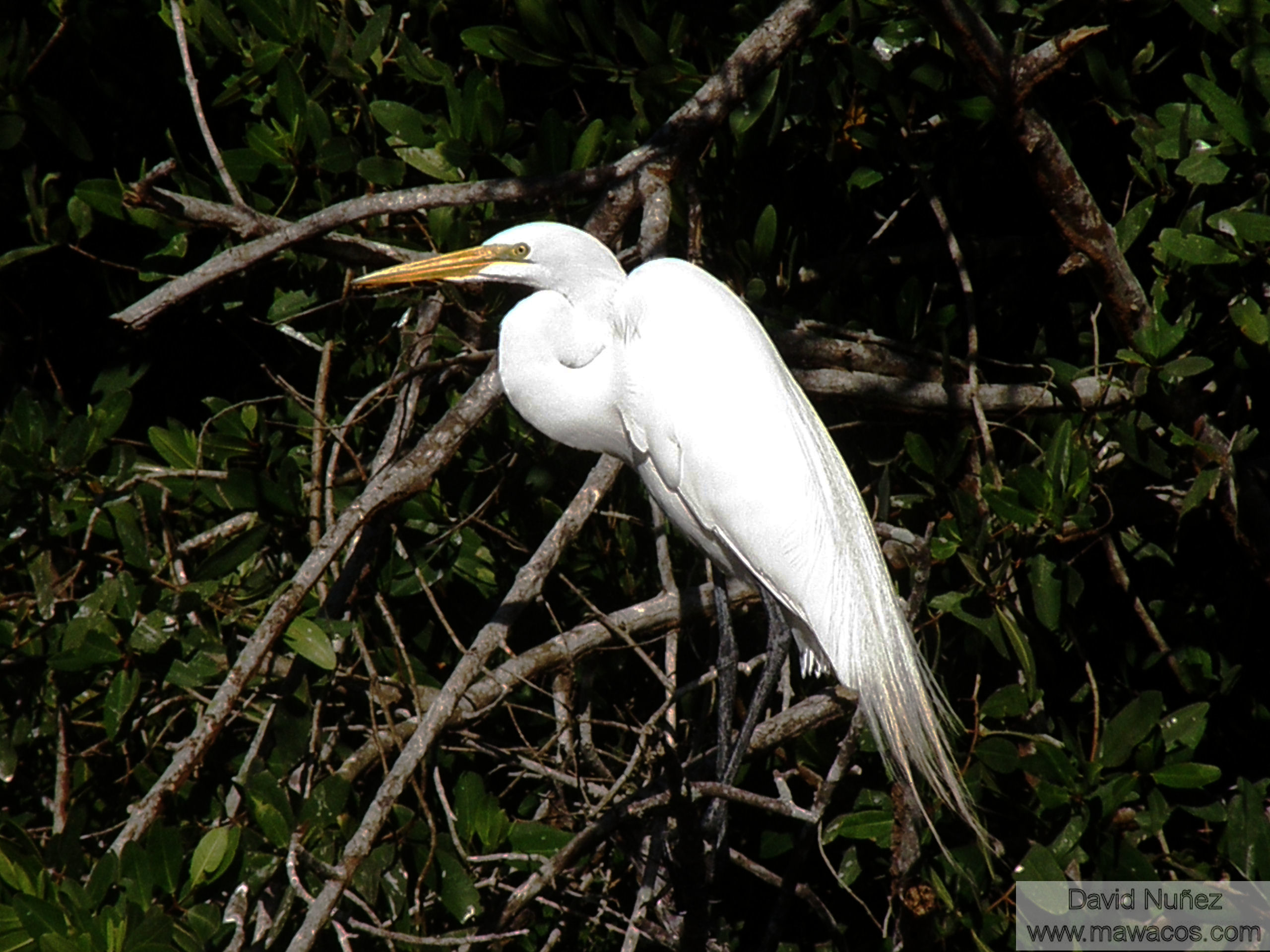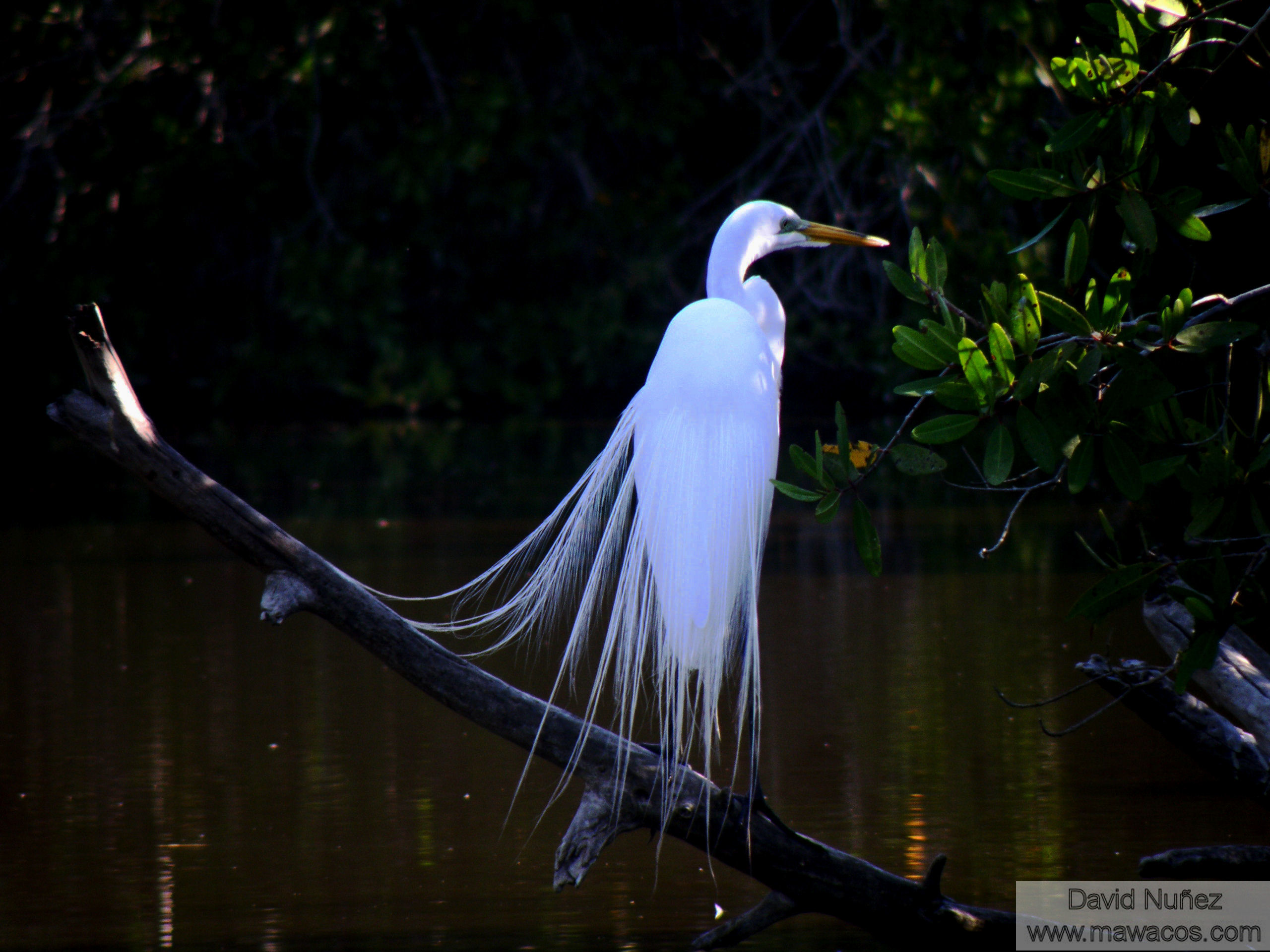 | Una de las aves más bellas de la región es aún más impresionante durante la temporada de anidación cuando exhibe largas y filamentosas plumas finas en la nuca, pecho y punta de las alas. Forma pareja de por vida, y anida en colonias mixtas con otras garzas. A veces se le ve revolviendo el agua con una pata estirada para espantar a su presa. |