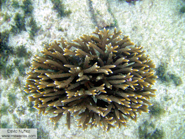 | Los corales que construyen el arrecife son conocidos como corales duros. Hay decenas de distintos tipos, pero los más obvios pueden identificarse fácilmente por sus nombres comunes: Cerebro, Cuerno de Alce, Lechuga y Fuego. Un poco menos obvios son los Estrella, Mostaza y Cactus. |