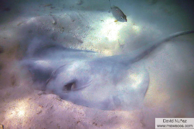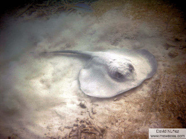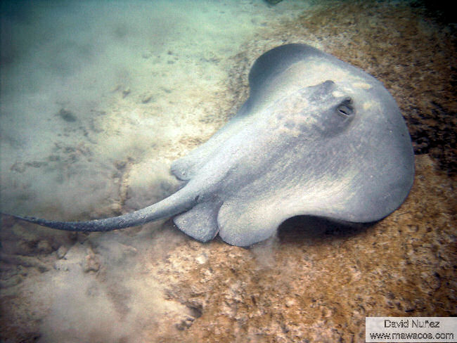 | Esta especie es mucho menos común que la Raya Látigo Americana y realmente sabemos muy poco sobre ella. Aunque es de apariencia similar, la diferencia más obvia es en la forma de las “alas” que en ésta especie son redondeadas, dándole un cuerpo más circular que el de su prima. Al igual que la Raya Látigo Americana, tiene una espina venenosa en la cola. |