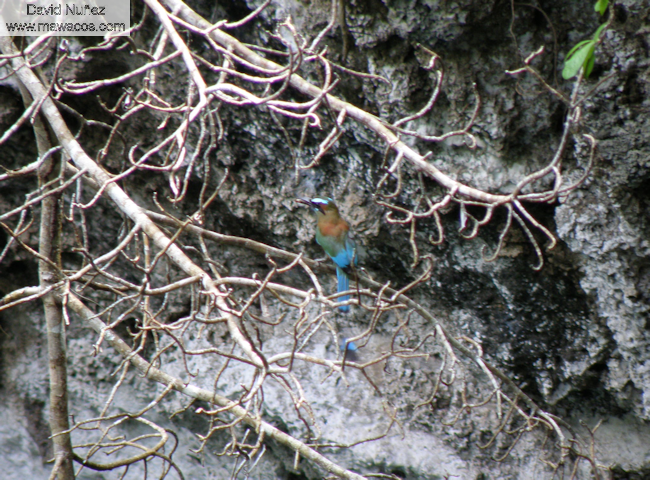 | There are at least 9 different species of Motmot, all of which are found in the American tropics. Their most distinguishing feature are two extra long raquet-shaped tail feathers which are swung side to side like a pendulum to let potential predators know they´ve been spotted. This behaviour has earned them the name of “clock bird”. Locally we can find the Turquoise Browed and the Blue Crowned, both are very colorful and are often found along forest edges, roads and near cenotes. They feed on insects, spiders, worms & lizards. |