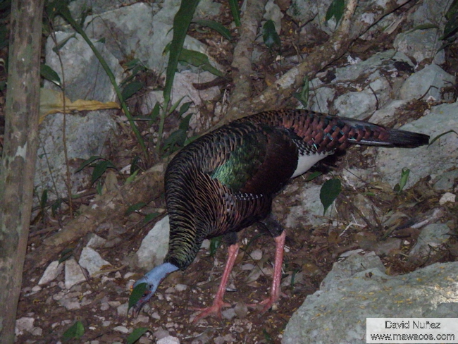 | Existen tan solo dos especies de guajolote en el mundo, ambas nativas a Norteamérica. El Ocelado se encuentra únicamente en la Península de Yucatán y en partes de los estados vecinos de Tabasco y Chiapas. Es huraño y puede ser dificil encontrarlo, pero es inconfundible por su cara azul y plumas coloridas. Pasa la mayor parte del día buscando alimento en el suelo, pero pernocta en la copa de árboles. Es considerado una especie Casi Amenazada debido a su caza y la pérdida de su hábitat. |