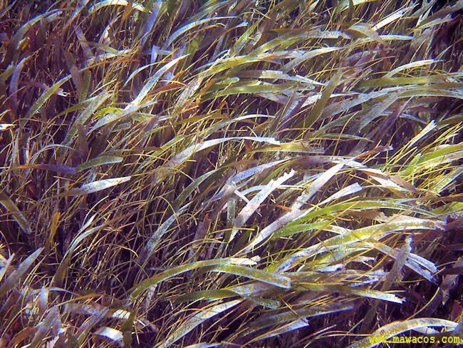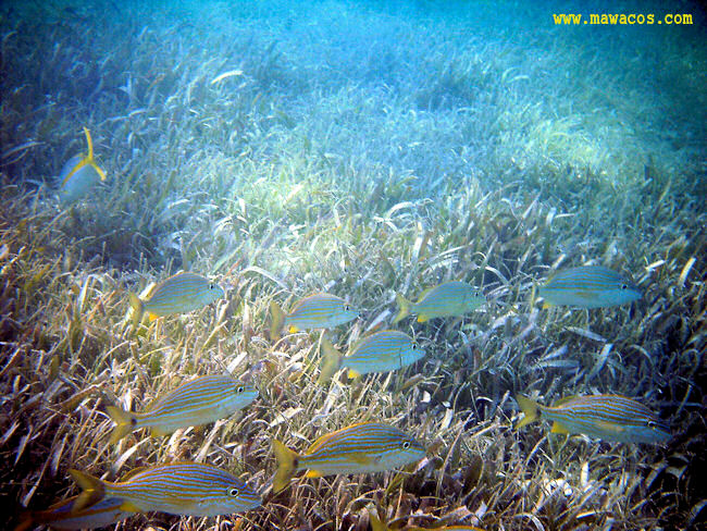 | Los pastos marinos se ubican entre los manglares y los arrecifes coralinos, y son un importante hábitat intermediario que ayuda a mantener las aguas cristalinas, brinda refugio a larvas y jóvenes de muchas especies marinas, y alimenta a algunas de las criaturas más notables del Caribe Mexicano, como son las Tortugas Marinas y los Manatíes. Existen unas 60 especies distintas de pastos marinos que encontramos en bahías y lagunas someras de fondo arenoso. Sus raíces amarran el fondo marino, y sus hojas frenan el agua. Esto ayuda a mantener las condiciones transparentes tan necesarias para la salud de los arrecifes coralinos. A nivel mundial está disminuyendo la cobertura de pastos marinos, amenazados por la contaminación que enturbia las aguas e impide que la luz solar penetre hasta el fondo, lo cual limita las profundidades a las cuales pueden crecerlos pastos. Esta contaminacióna de más favorece el crecimiento de algas a expensas de los pastos, y las algas flotantes bloquean aún más luz solar. La sobrepesca complica la situación al eliminar a especies que se alimentan de las algas. |