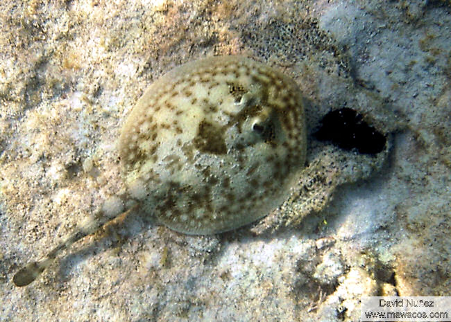 | Bastante más pequeña que otras rayas con espina, la Redonda ó Pintada llega a medir 65 cm de largo, con un diámetro corporal de 30 cm. Su coloración es variable, pero el cuerpo generalmente se encuentra cubierto de rayas onduladas y manchas oscuras. Tiene una espina venenosa en la cola capaz de causar heridas severas. Se entierran en la arena y esperan a su presa, a la cual sorprenden saltando sobre ella. También se les ha observado levantando la parte frontal del cuerpo para crear un área de sombra que atrae a su presa y la guía directamente a su boca. |
