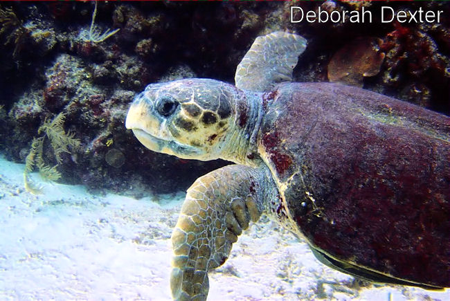 | Though commonly encountered on scuba dives on the reef, it rarely ventures into the bays and lagoons of the Mexican Caribbean. These turtles have a massive head with powerful jaws used to feed on shellfish (conch, clams, and crabs). It has a wider range and travels further than either Greens or Hawksbills, and unlike the previous two, it mates during migration. They reach maturity at around 35 years of age, and individuals have been known to live over 100 years. It is believed that Loggerheads spend their early years hiding out among the floating seaweeds of the Sargasso Sea. Like other sea turtles, it has been hunted throughout history for its meat, eggs, fat and shell. The biggest current threat is its accidental capture by commercial fisheries, which kills tens of thousands of migrating Loggerheads each year. |