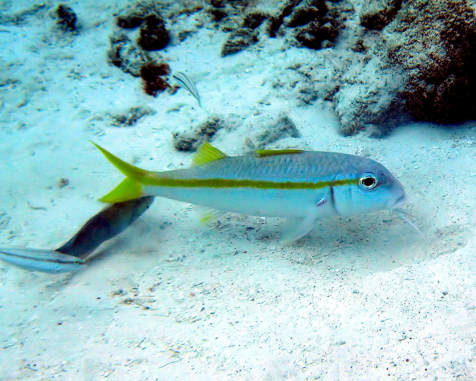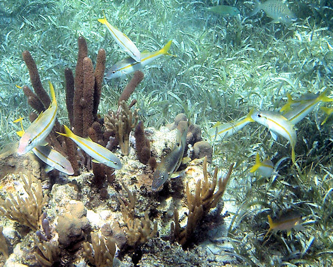 | This one looks a lot like the Yellowtail Snapper in that is has a yellow stripe down the middle of its body. The difference is that this one has ¨whiskers¨ and lacks the spots. |