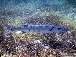 The Barracuda family includes 18 species across all tropical and subtropical oceans worldwide. They have an elongated body with a protruding lower jaw that displays large sharp teeth. Their reputation as fierce predators of other fish is well deserved, but documented reports of attacks on swimmers are extremely rare. These cases seem to be related to conditions of low-visibility, and occasions in which humans were feeding or otherwise provoking the animals. They usually involve a single quick bite which is not repeated. Perhaps their tendency to approach divers and snorkelers out of curiosity adds to their fearsome reputation. To discourage unwelcome attention, swimmers may want to remove any shiny jewelry before going in the water. Juveniles are often found in small schools, and though adults may also form groups they are usually solitary. Individuals may also herd schools of prey fish, keeping them in shallow waters and feeding on them at will. The Great Barracuda are found in both open water or near coastal reefs, seagrass beds and mangroves. Though often seen in shallow waters, they are also found at depths of up to 100 meters. Larvae settle in shallow waters with abundant vegetation and juveniles spend their first year hiding out among mangroves or seagrasses, before moving on to the reef in their second year. Juveniles can change color to match their surrounding. They can grow to be 2 meters in length and weigh 50 kg. Their lifespan is estimated around 14 years. Great Barracuda rely on their eyesight to catch a large array of prey, so they are active during the day and prefer clear waters. Their streamlined body allows them to swim at up to 55 km/h for short surprising bursts. They in turn may be eaten by sharks, tuna or Goliath grouper. |